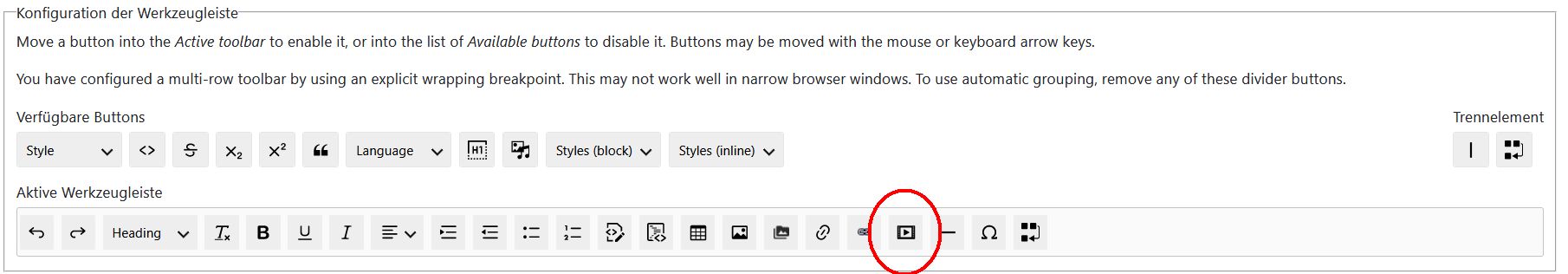 Wer häufig Videos einbetten möchte, kann auch das Modul "CKEditor 5 Media Embed" installieren. Damit erhält man im Editor einen eigenen Button, über den sich Videos per URL oder den Quellcode (s.o.) einbinden lassen. Nach der Installation muss der Media-Button über "Konfiguration-Texteditorformate" in den Editor verschoben werden.
