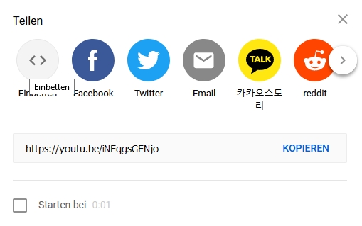 Video bei youtube (oder ähnlichen Anbietern) aufrufen. Unter dem Video findet ihr den Button "Teilen". Nach dem Anklicken erscheint dieses Fenster: