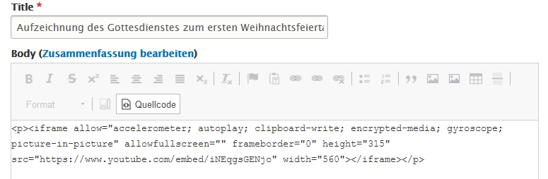 Noch einmal auf den Button "Quelltext" klicken und das Video sollte sichtbar sein. Abschließend das Speichern der Seite nicht vergessen.