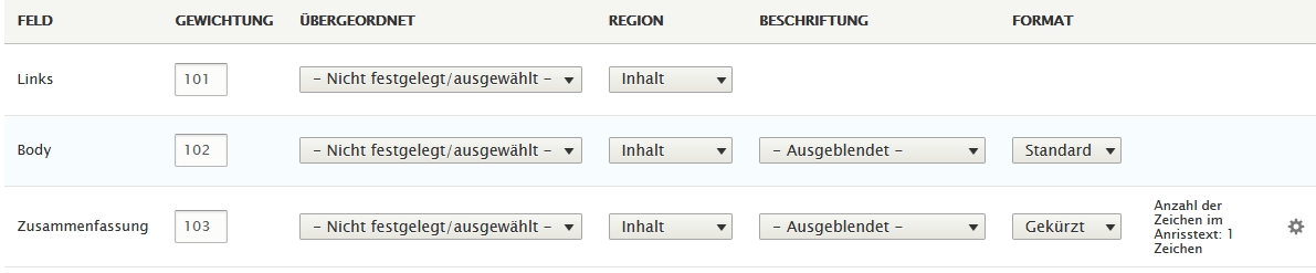 Drupal 10 bietet in der Grundeinstellung keine Möglichkeit, um die Teaser für die Startseite zu formatieren. Das kann man aber leicht umgehen: In den Inhaltstypen, die auf der Startseite erscheinen sollen, das Standard-Body-Feld löschen. Dann ein neues Feld "Body" hinzufügen, Feldtyp "Text (formatiert, lang)". Dazu ein weiteres Feld "Zusammenfassung", ebenfalls Feldtyp "Text (formatiert, lang)". In den Feldansichten einstellen, dass das Feld "Zusammenfassung" normalerweise gekürzt auf 1 Zeichen dargestellt wird: